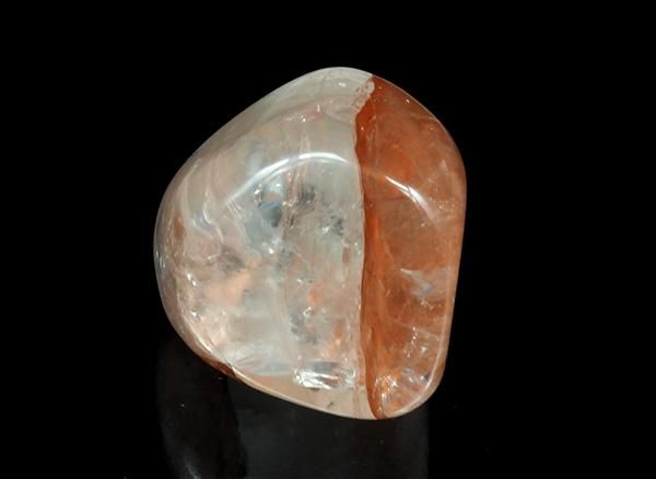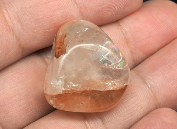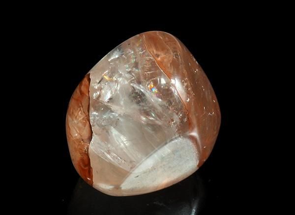 ホワイトオパールとオレンジ&レッドカルセドニーが共生した後にクォーツ化したとても珍しい石です。地元インドではムーラン・クォーツとも呼ばれています。虹色のイリデッセンス効果もみられます。