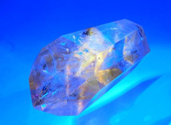 ブラジル・バイーア州コルデイロス産のレインボーファントムアメジストのポリッシュポイントです。虹色のイリデッセンスも確認できます。これだけ美しいアメジストはなかなかお目にかかれません。ファントム部分にUVライトを当てると幻想的な光を放つことから、この名称を使用しておりますが、鑑定の結果、パウエライトは含まれず、それ以外の蛍光鉱物が含まれており、流通名としてパウエライト・ファントムアメジストとされています。一部では、灰重石(シーライト:Scheelite)変種や、鉄イオンの影響による発色が関係している可能性も示唆されていますが、実際には正体不明の蛍光鉱物が含まれている可能性が高いというのが現状です。