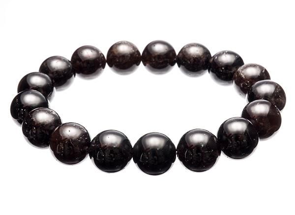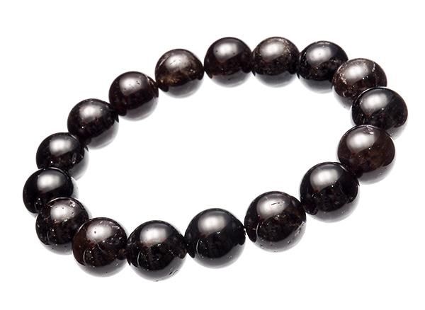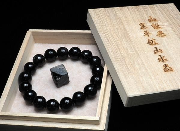 モリオン・クォーツSA(黒水晶)約12mm(17粒)腕回り:約17cm・桐箱・原石つき
