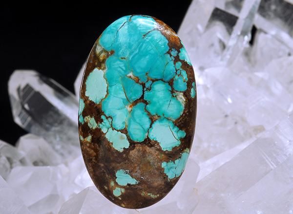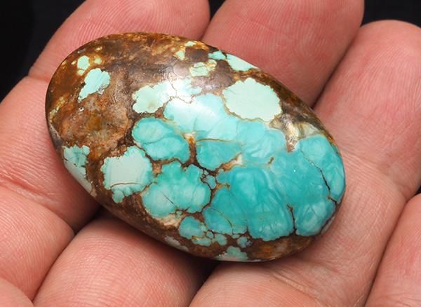 1929年から1961年まで採掘されていましたが、こちらはすでに閉山になったアメリカ・ネバダ州のアメリカ・ネバダ州Carlin近郊ににある通称ナンバーエイト鉱山(第8区鉱山)のターコイズです。特徴はグリーンがかった独特の色味、そして母岩にマトリックス状に入ったスパイダーウェブです。すでに埋め立てられて、出てくることもなくなったナンバーエイトの原石ですが、こちらは当時、入手していた業者の放出品です。現在では高品質な原石は非常に希少で、コレクターの間でも人気が高く、価格も上昇傾向にあります。