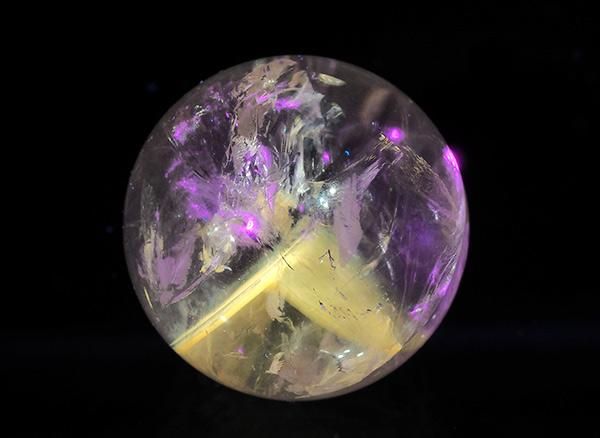 ブラジル・バイーア州コルデイロス産のレインボーファントムアメジストのスフィアです。これだけ美しいアメジストはなかなかお目にかかれません。ファントム部分にUVライトを当てると幻想的な光を放つことから、この名称を使用しておりますが、鑑定の結果、パウエライトは含まれず、それ以外の蛍光鉱物が含まれており、流通名としてパウエライト・ファントムアメジストとされています。一部では、灰重石(シーライト:Scheelite)変種や、鉄イオンの影響による発色が関係している可能性も示唆されていますが、実際には正体不明の蛍光鉱物が含まれている可能性が高いというのが現状です。