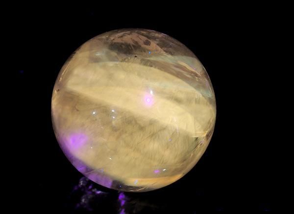 ブラジル・バイーア州コルデイロス産のレインボーファントムアメジストのスフィアです。これだけ美しいアメジストはなかなかお目にかかれません。ファントム部分にUVライトを当てると幻想的な光を放つことから、この名称を使用しておりますが、鑑定の結果、パウエライトは含まれず、それ以外の蛍光鉱物が含まれており、流通名としてパウエライト・ファントムアメジストとされています。一部では、灰重石(シーライト:Scheelite)変種や、鉄イオンの影響による発色が関係している可能性も示唆されていますが、実際には正体不明の蛍光鉱物が含まれている可能性が高いというのが現状です。