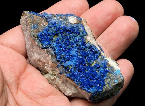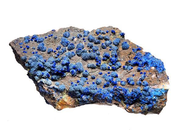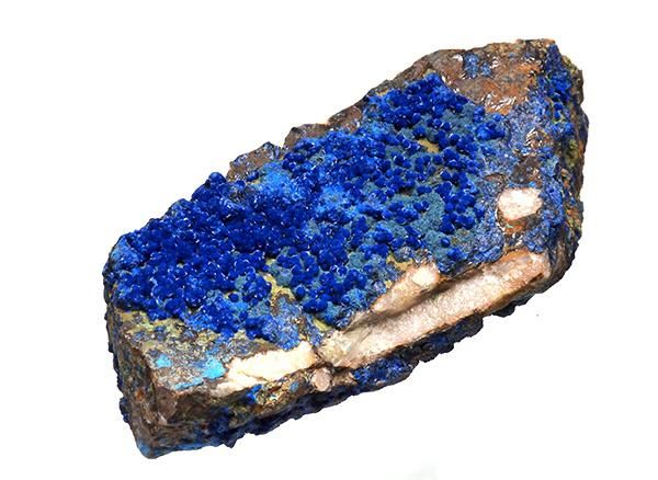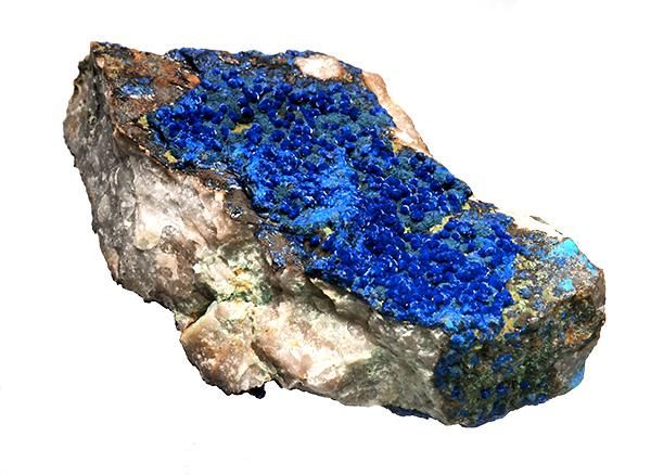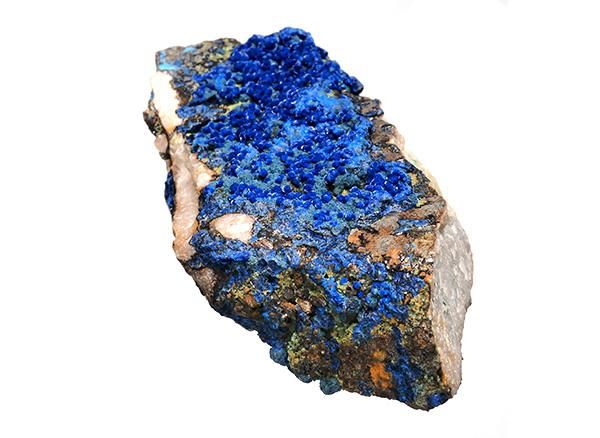 紺青の花と呼ばれるアズライトは古来より青をあらわす顔料や岩絵の具の原材料として使用されていました。アズライトは銅鉱床が形成された後に,変成作用や変質作用などで形成された二次鉱物で、銅鉱床の花とも呼ばれ、マラカイトと共生しやすい鉱物です。