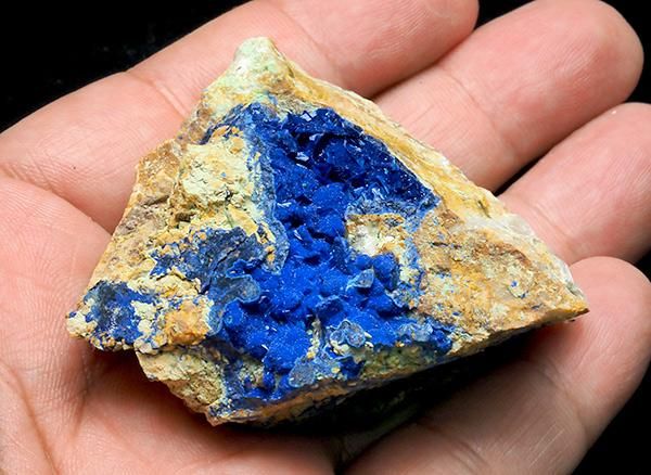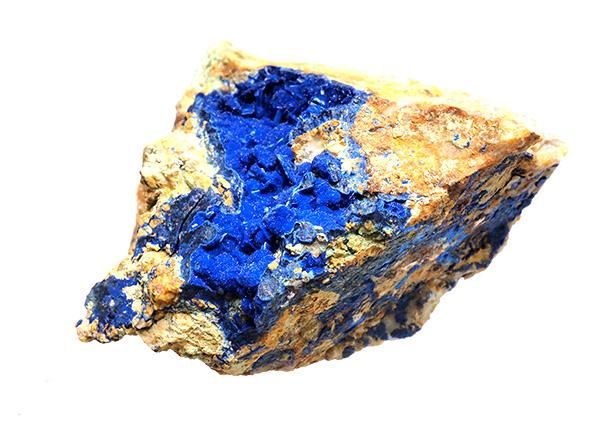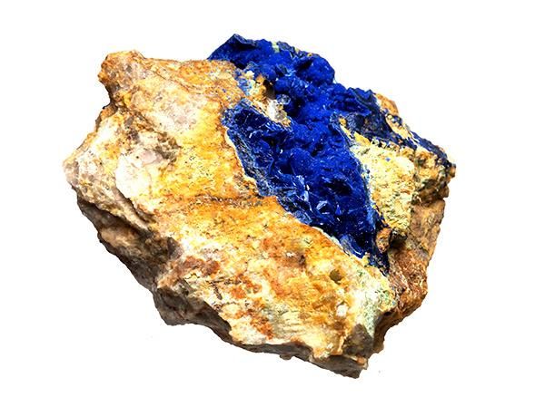 紺青の花と呼ばれるアズライトは古来より青をあらわす顔料や岩絵の具の原材料として使用されていました。アズライトは銅鉱床が形成された後に,変成作用や変質作用などで形成された二次鉱物で、銅鉱床の花とも呼ばれ、マラカイトと共生しやすい鉱物です。