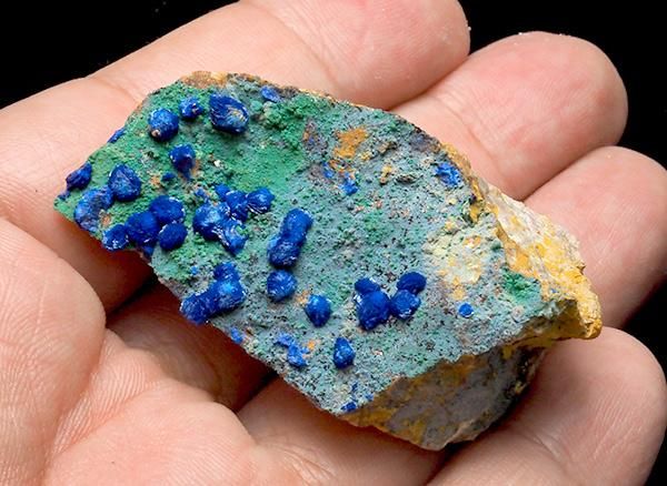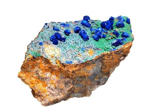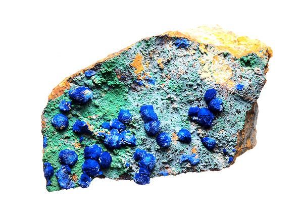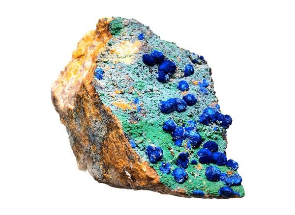 紺青の花と呼ばれるアズライトは古来より青をあらわす顔料や岩絵の具の原材料として使用されていました。アズライトは銅鉱床が形成された後に,変成作用や変質作用などで形成された二次鉱物で、銅鉱床の花とも呼ばれ、マラカイトと共生しやすい鉱物です。
