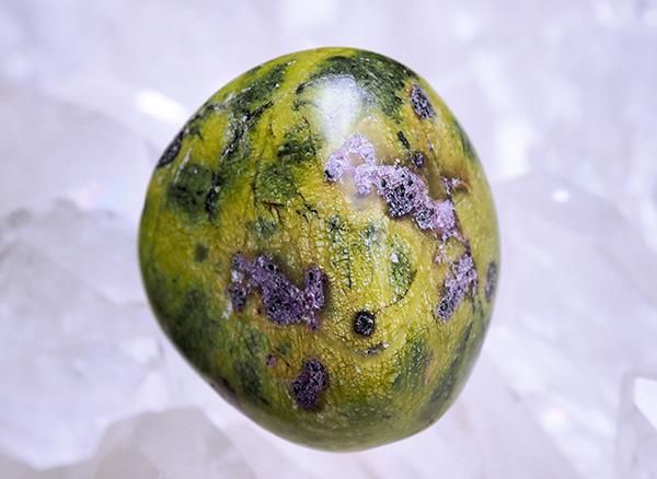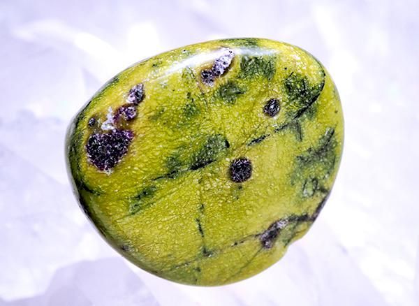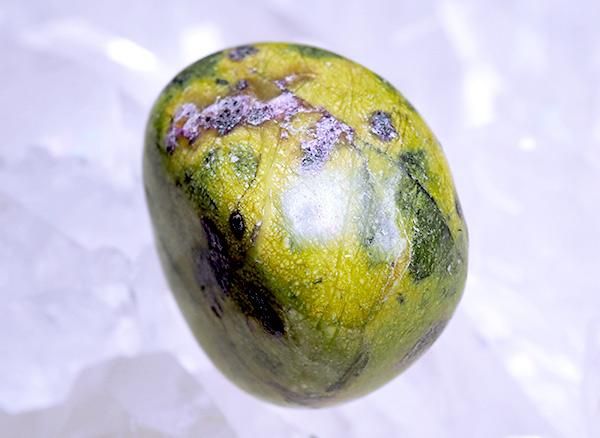 オーストラリア・タスマニア産のアトランティサイトのタンブルです。アトランティサイトは、緑色のセルプチン(セリサイト)と紫色のスティヒタイトが組み合わさって形成されるコンポジットストーンです。これらの成分が作り出す緑と紫のコントラストが非常に特徴的です。スピリチュアルなワークやヒーリングにおいて非常に人気の高い石です。