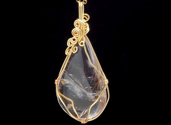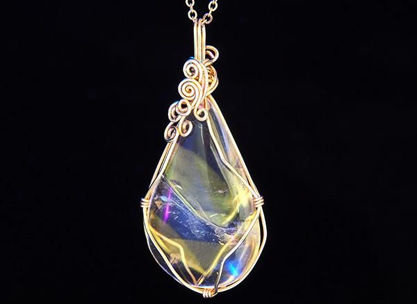 ブラジル・バイーア州コルデイロス産のレインボーファントムアメジストのワイヤーペンダントトップです。これだけ美しいアメジストはなかなかお目にかかれません。ファントム部分にUVライトを当てると幻想的な光を放つことから、この名称を使用しておりますが、鑑定の結果、パウエライトは含まれず、それ以外の蛍光鉱物が含まれており、流通名としてパウエライト・ファントムアメジストとされています。一部では、灰重石(シーライト:Scheelite)変種や、鉄イオンの影響による発色が関係している可能性も示唆されていますが、実際には正体不明の蛍光鉱物が含まれている可能性が高いというのが現状です。