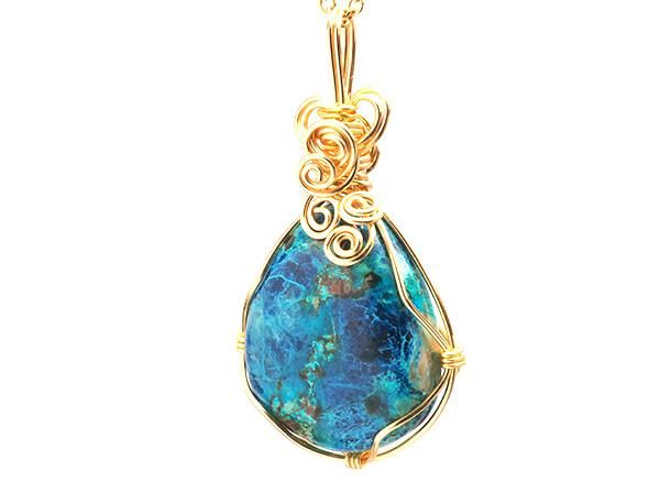 とても美しいブルーのクリソコラをゴールドカラーのK14GFアーティスティックワイヤーで巻いてペンダントトップにしました。