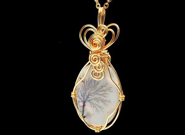 ブラジル産のデンドリックアゲートのカボションルースをゴールドカラーのアーティステックワイヤーで巻いてペンダントトップにしました。自然が作り出した模様をお楽しみください。