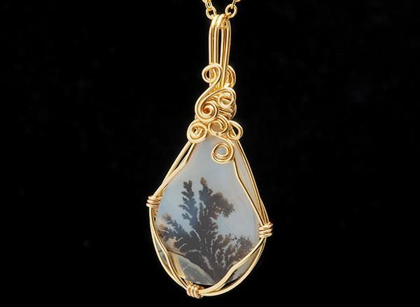 ブラジル産のデンドリックアゲートのカボションルースをゴールドカラーのアーティステックワイヤーで巻いてペンダントトップにしました。自然が作り出した模様をお楽しみください。