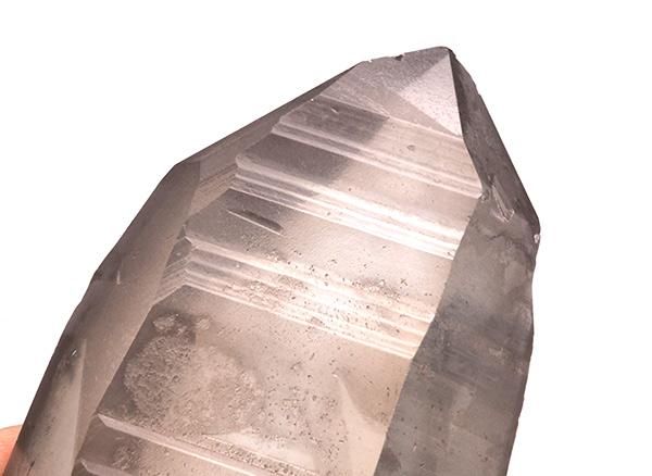 レムリアンシードは柱面にレムリアンリッジと呼ばれるバーコード状の縞条線やレコードキーパー(三角形)やトライゴーニック(逆三角形)と呼ばれる三角形の食像などが見られるのが特徴ですが、こちらは透明感があり、レムリアンリッジが見られるタイプです。