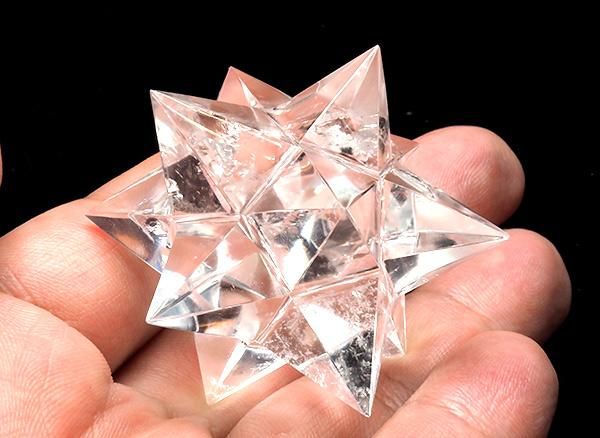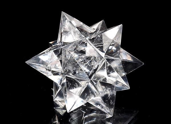 こちらは小星型十二面体の水晶です。小星型十二面体には五芒星であるペンタグラムと六芒星(ダビデの星)であるヘキサグラムが同一化している12の頂点をもつ星型形状で、アステロイドともよ呼ばれています。