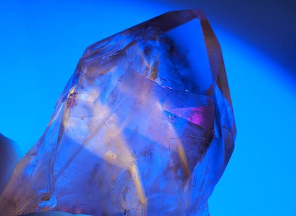 ブラジル・バイーア州コルデイロス産のファントムアメジストのポイントです。一部ポリッシュされています。虹色のイリデッセンスも確認できます。これだけ美しいアメジストはなかなかお目にかかれません。ファントム部分にUVライトを当てると幻想的な光を放つことから、この名称を使用しておりますが、鑑定の結果、パウエライトは含まれず、それ以外の蛍光鉱物が含まれており、流通名としてパウエライト・ファントムアメジストとされています。一部では、灰重石(シーライト:Scheelite)変種や、鉄イオンの影響による発色が関係している可能性も示唆されていますが、実際には正体不明の蛍光鉱物が含まれている可能性が高いというのが現状です。