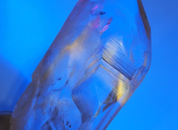 ブラジル・バイーア州コルデイロス産のファントムアメジストのポイントです。一部ポリッシュされています。虹色のイリデッセンスも確認できます。これだけ美しいアメジストはなかなかお目にかかれません。ファントム部分にUVライトを当てると幻想的な光を放つことから、この名称を使用しておりますが、鑑定の結果、パウエライトは含まれず、それ以外の蛍光鉱物が含まれており、流通名としてパウエライト・ファントムアメジストとされています。一部では、灰重石(シーライト:Scheelite)変種や、鉄イオンの影響による発色が関係している可能性も示唆されていますが、実際には正体不明の蛍光鉱物が含まれている可能性が高いというのが現状です。