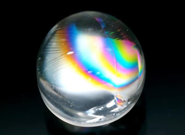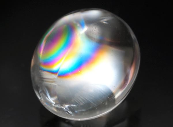 気の遠くなる時間の流れの中で水晶が成長する過程において、地球規模のエネルギーが加わると水晶はゆがんだり、内部にクラックが入ったりします。そのクラック層の中で光の干渉現象で現れる虹色効果(虹色のイリデッセンス)をもつ水晶がレインボークオーツです。また、成長の途中過程で他の鉱物が薄い膜を張ることで、虹色効果(虹色のイリデッセンス)が出るものもあります。