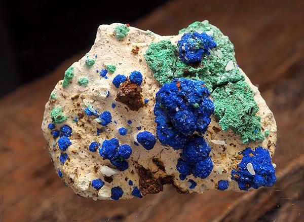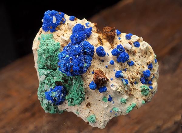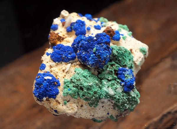 紺青の花と呼ばれるアズライトは古来より青をあらわす顔料や岩絵の具の原材料として使用されていました。アズライトは銅鉱床が形成された後に,変成作用や変質作用などで形成された二次鉱物で、銅鉱床の花とも呼ばれ、マラカイトと共生しやすい鉱物です。
